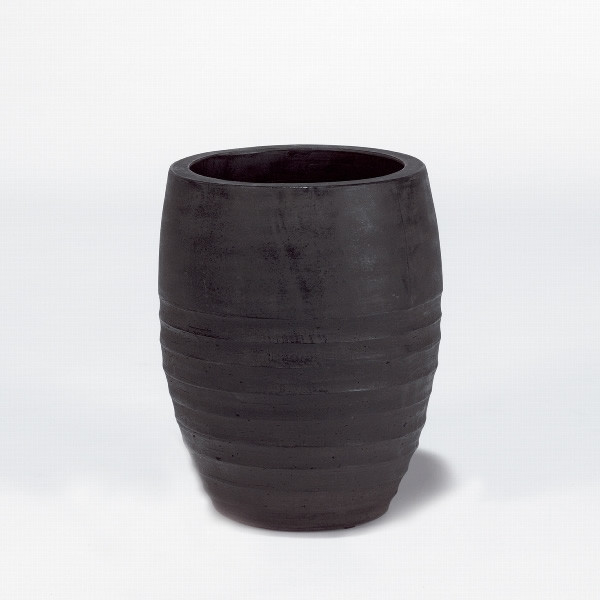 Das dickwandige Gefäß basiert auf afrikanischen Grundformen mit abgesetzten Querrillen.