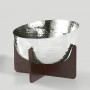 Die Schale Olivia ist eine nicht alltägliche Lösung für eine multifunktional einsetzbare Schale. Die vernickelte, handgetriebene Schale sitzt ohne Befestigung auf einem dunkel lackierten Messing-Fuß.