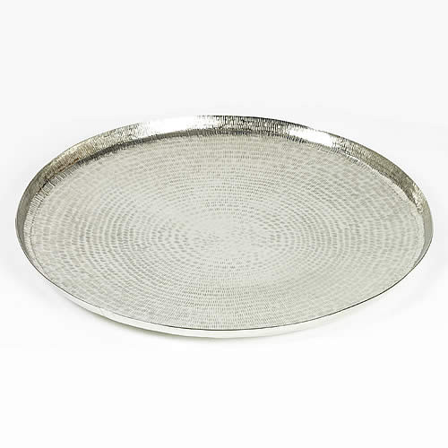 Aus feinem Aluminiumblech wird das großzügig bemessene runde Tablett Masirah von Hand gehämmert, getrieben und anschließend an der Oberfläche glänzend vernickelt.