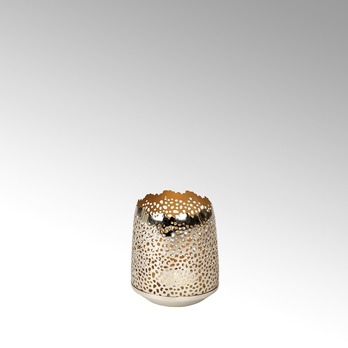 Aus feinem Metallblech wird in einer speziellen Ätztechnik, die wie zufällig anmutende Perforierung des Windlichtes ausgearbeitet.