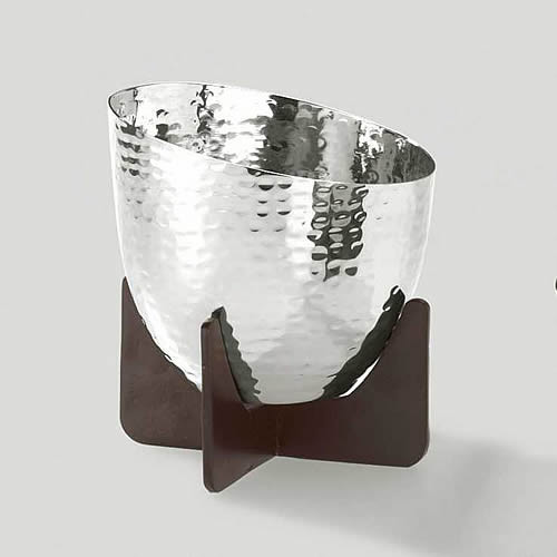 Die Schale Olivia ist eine nicht alltägliche Lösung für eine multifunktional einsetzbare Schale. Die vernickelte, handgetriebene Schale sitzt ohne Befestigung auf einem dunkel lackierten Messing-Fuß.