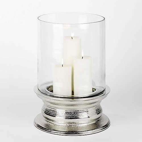 Dem Windlicht Makani gibt die Kombination des handwerklich gehämmerten Metallfußes mit dem klaren Glaszylinder besondere Eleganz. Der Fuß des Windlichts Makani ist aus gegossenem Aluminium hochglänzend vernickelt.