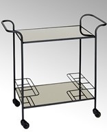 Die stabile u. doch filigrane Metallrohrkonstruktion ist seidenmatt – schwarz, pulverbeschichtet u. trägt zwei getönte Rauchglas-Spiegel. Die 5 mm starken Flächen tragen jeweils bis zu 25 Kg Gewicht. Die untere Ebene verfügt über zwei praktische Flaschenhalter, so dass die wertvollen Whiskeys o. Champagner nicht vom Wagen rutschen können.