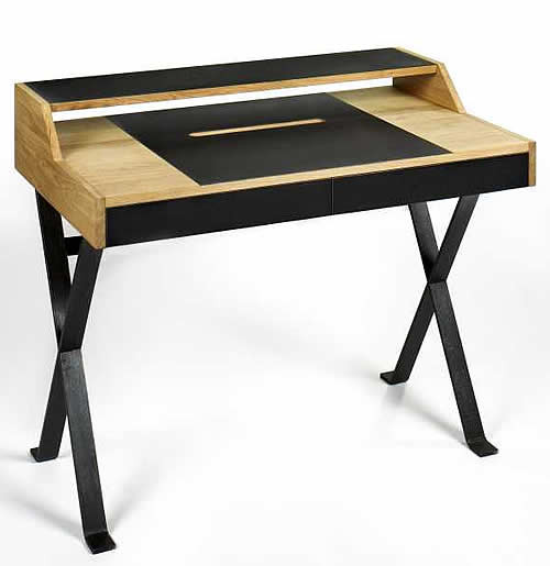 Die faszinierende, lebhafte Struktur des edlen Hartholzes Eiche und die ausgezeichneten Eigenschaften von Linoleum machen den Schreibtisch Stanley zu einem praktischen Alltagsbegleiter. Die geschmiedeten, pulverbeschichteten Eisenprofile mit ihren archaischen Schraub- und Schweißverbindungen sorgen für Standfestigkeit. Der Schreibtisch bietet zwei außergewöhnlich tiefe Schubladen und in der Mitte der mit Linoleum belegten Arbeitsfläche eine praktische Stiftmulde.