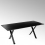 Die Tischplatte aus tiefschwarz gebeiztem Sägezahnfurnier wird mit einem geschmiedeten Untergestell kombiniert.