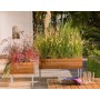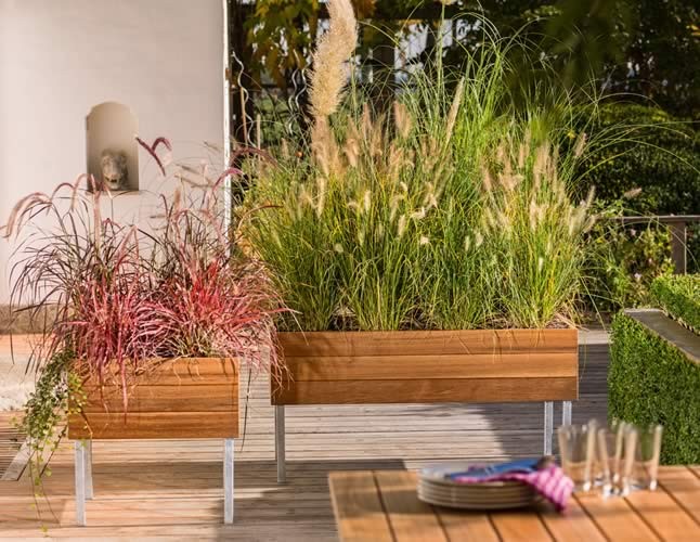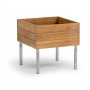Ein Pflanzenbehälter aus massivem Teakholz mit Füßem aus Edelstahl für Ihre Blumen und Pflanzen im Außenbereich.