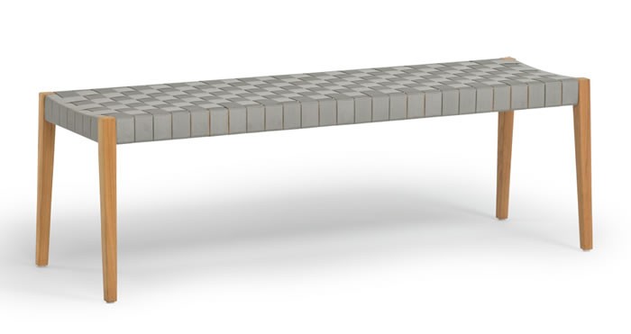 Im filigranen Design, aus massiven, verleimten Teak und einer Sitzfläche aus Gurtgeflecht in verschiedenen Farben, lässt sich die Bank Wipp sowohl im Außenbereich als auch im Innenbereich einsetzen. Die wetterfesten Gurtbänder der Sitzflächen werden von uns in den Farben taupe, silbergrau oder schwarz angeboten.