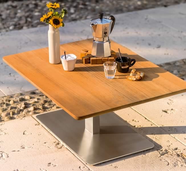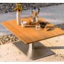 Die in klarer Form, handwerklich gearbeitete Beistelltisch-Teakplatte mit Metallfuß ist einzigartig in Verarbeitung und Qualität.