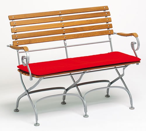 Die klappbare 2-Sitzer Bank Classic mit Armlehnen wurde über lange Zeit hinweg immer weiter mit hochwertigeren Materialien und modernerer Technik verbessert ohne dabei den klassischen Stil zu verlieren. Das Gestell wird aus hochwertigem, verzinktem Bandstahl gefertigt und anschließend pulverbeschichtet. Zudem werden die Gelenke mit Zinkbuchsen ausgestattet. Die Belattung besteht aus Teak massiv, unbehandelt und wird mittels durchgängiger Edelstahl-Schloßschrauben und selbstsichernden Edelstahl-Muttern mit den Gestell verschraubt. Nylonbodengleiter bieten den Gestelle weiteren Schutz.