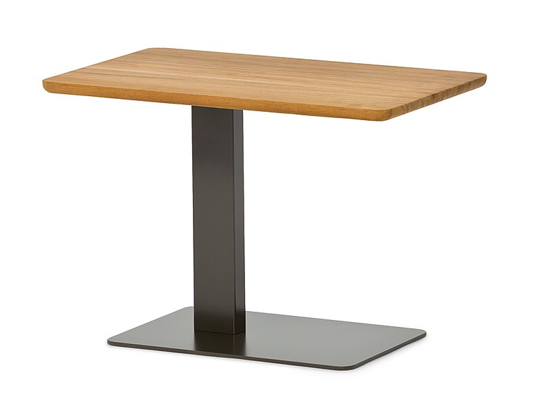 Die in klarer Form, handwerklich gearbeitete Beistelltisch-Teakplatte mit Metallfuß ist einzigartig in Verarbeitung und Qualität.