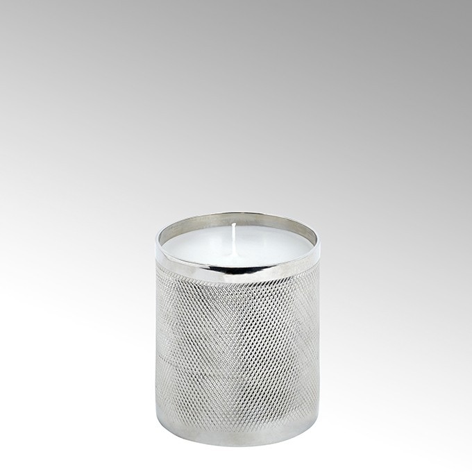 Das edle Kerzengefäß ist aus Aluminium gefertigt u. wird von Hand mit einer geometrischen Struktur versehen