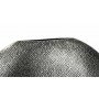 Eine  flache, linsenförmige Vase mit fein ziselierter Oberfläche und einem matt, metallischen Glanz von Graphit.