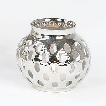 Die elegante bauchige Form des Winlichtes Destello ist mit runden Durchbrüchen versehen, die das Kerzenlicht durchschimmern lassen. Jedes Loch wird einzelnen ausgeschnitten und nachpoliert, bevor das Windlicht im zweiten Schritt vernickelt wird.
