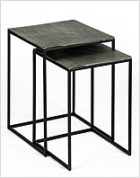 Zwei kleine Beistelltische, schlank und hoch, mit filigranen aber soliden Metall-Untergestellen und einer Abstellfläche aus Aluminium.