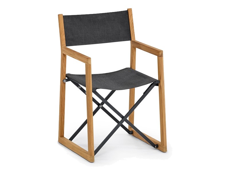 Der Teakholz Klappsessel Loft mit absolut wetterfesten, pulverbeschichteten Aluminiumdetails greift die klassische Form des klappbaren Regiestuhls auf.