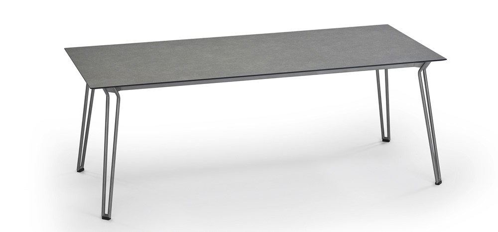 Die wetterfesten Tischplatten wahlweise aus HPL o. Teakholz massiv, unbehandelt mit einer Edelstahl Tischzarge eingefasst.